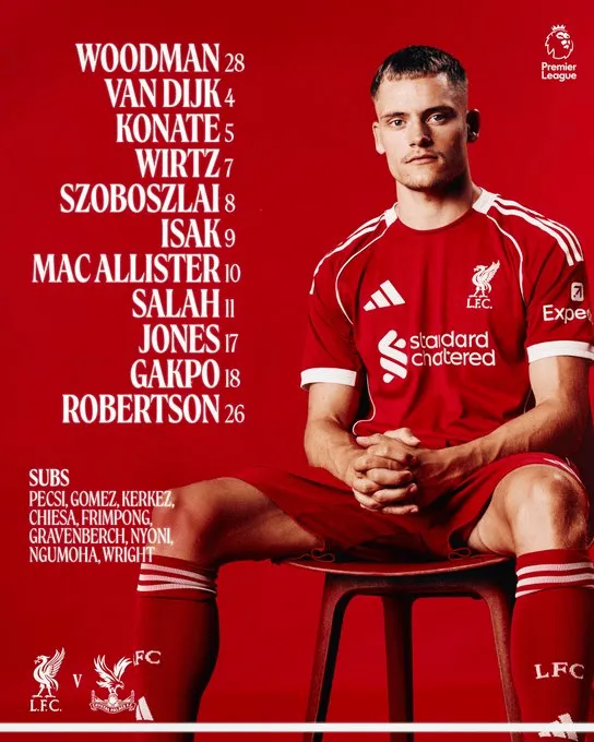 利物浦首发:28-伍德曼、4-范戴克、5-科纳特、7-维尔茨、8-索博斯洛伊、9-伊萨克、10-麦卡利斯特、11-萨拉赫、17-琼斯、18-加克波、26-罗伯逊