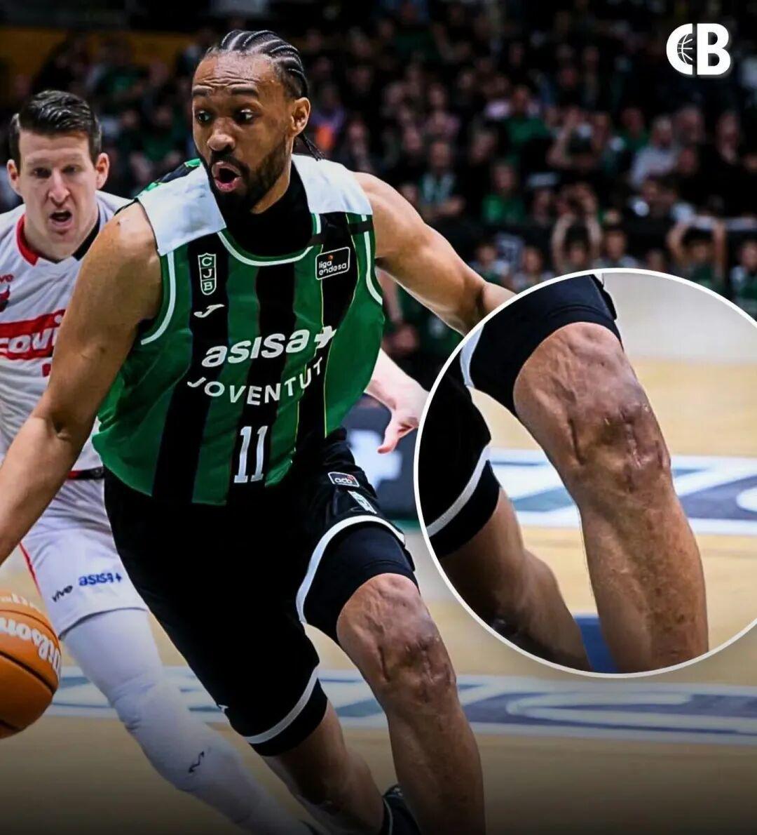 图中的男人是贾巴里·帕克,如今在西班牙联赛继续生涯。他的膝盖上布满疤痕,沟壑纵横,那是两次前交叉韧带(ACL)撕裂留下的勋章——2014年新秀赛季报销、2017年同一处巅峰期再遭重创,让这位天赋炸裂的锋线,一步步从NBA舞台边缘退场。